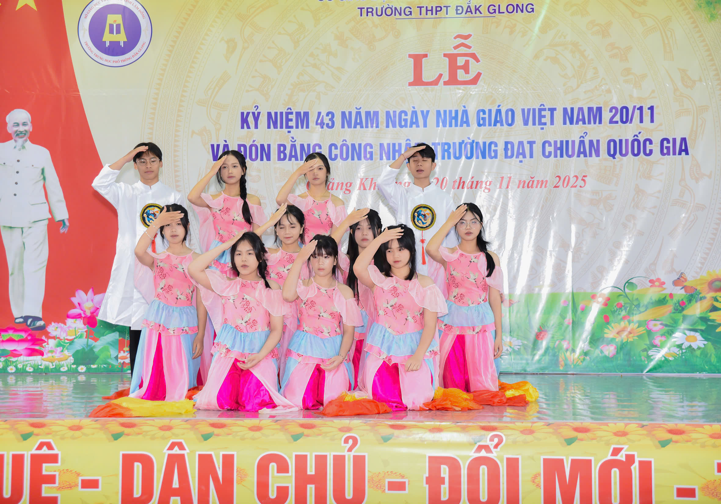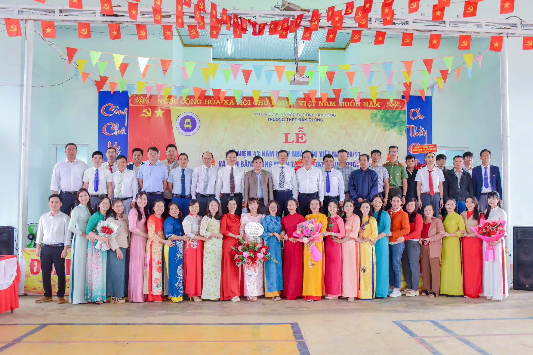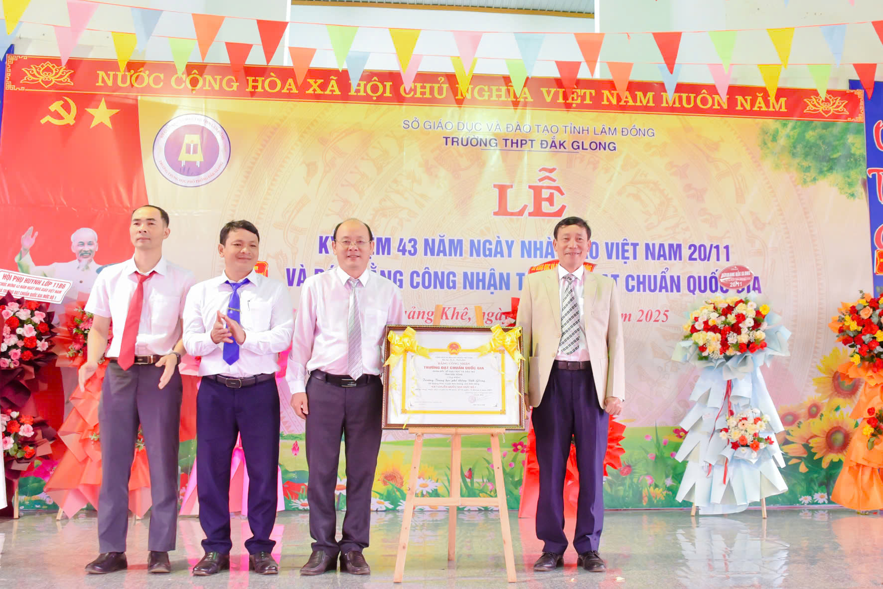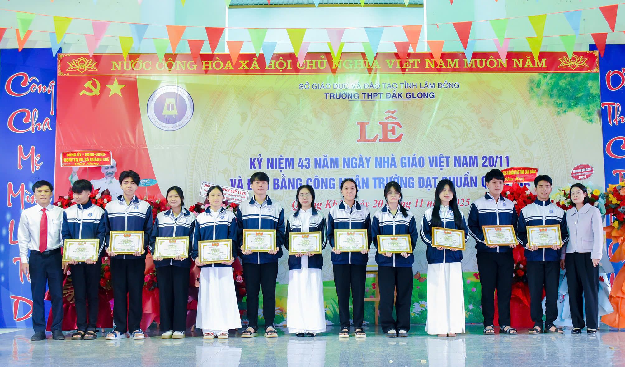 Tháng 11 lại về, hòa chung với niềm hân hoan của cả nước hướng về ngày 20 tháng 11 – Ngày tôn vinh những thầy cô giáo đã tận tâm gieo hạt tri thức, ươm mầm nhân cách cho bao thế hệ học trò; hôm nay vào lúc 07h45 phút ngày 20/11/2025, trường THPT Đăk Glong long trọng tổ chức Lễ kỷ niệm 43 năm Ngày Nhà giáo Việt Nam (20/11/1982 – 20/11/2025) và đón Bằng công nhân trường chuẩn quốc gia mức độ 1.